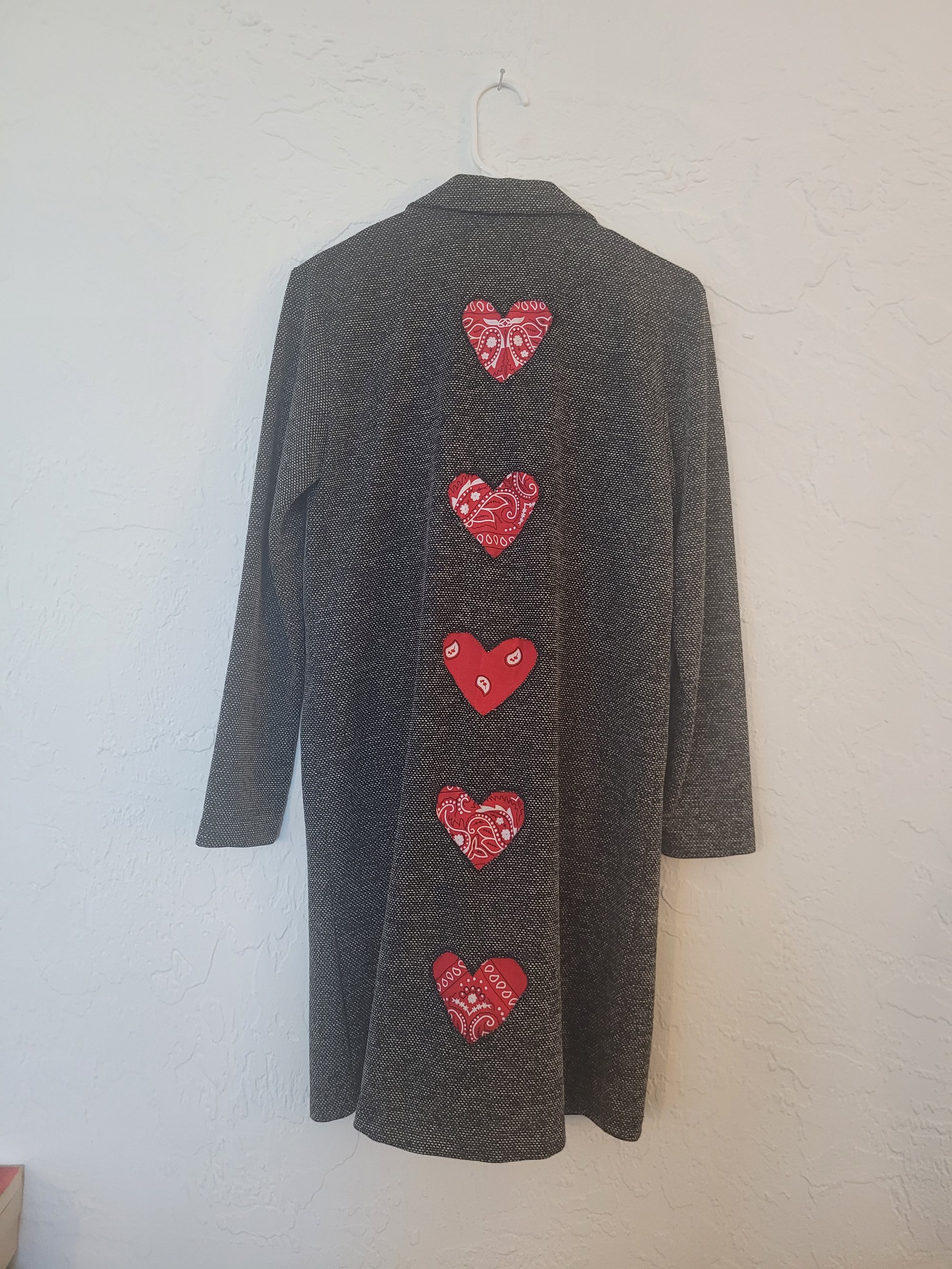 Polyester/Viscose Coat with red bandana heart design cut-ins. 36 inches long.