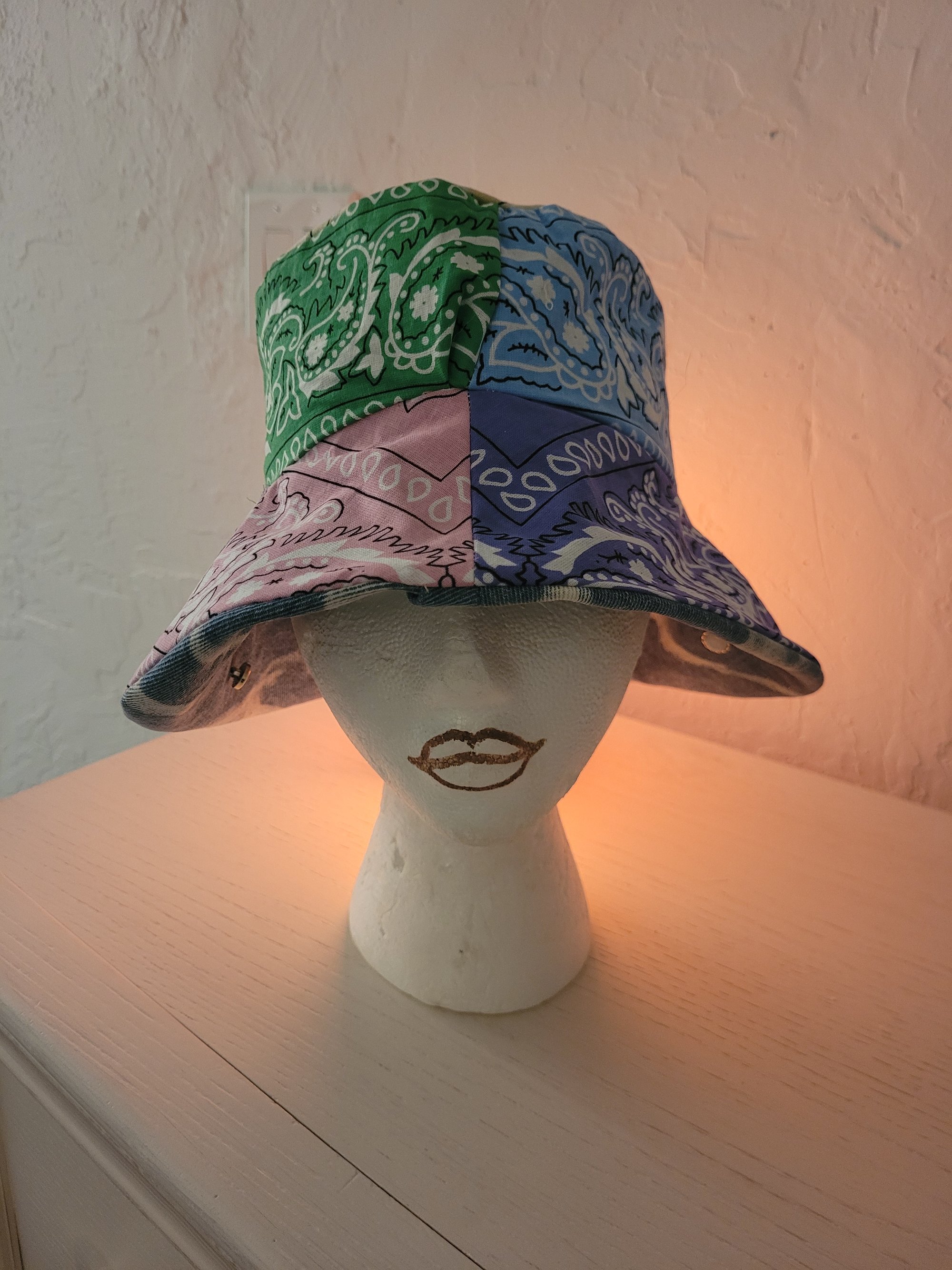 Additional specs: Designed to be worn "center-part" style with seam facing forward above forehead and longer drape towards back. 1 of 1/no reproductions are made, Reversible style, & gentle washer machine friendly then air dry. Four different bandanas used in combination with streaked denim & accent handsewn buttons.